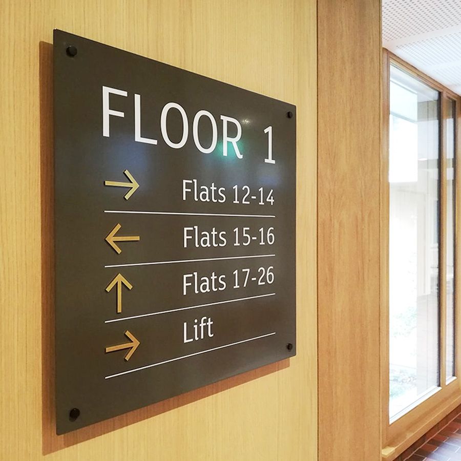 Wayfinding signs can be made from aluminium, acrylic, Foamex, or Dibond panels, depending on whether they are used indoors or outdoors. Vinyl graphics can also be applied directly to walls, doors, or floors.