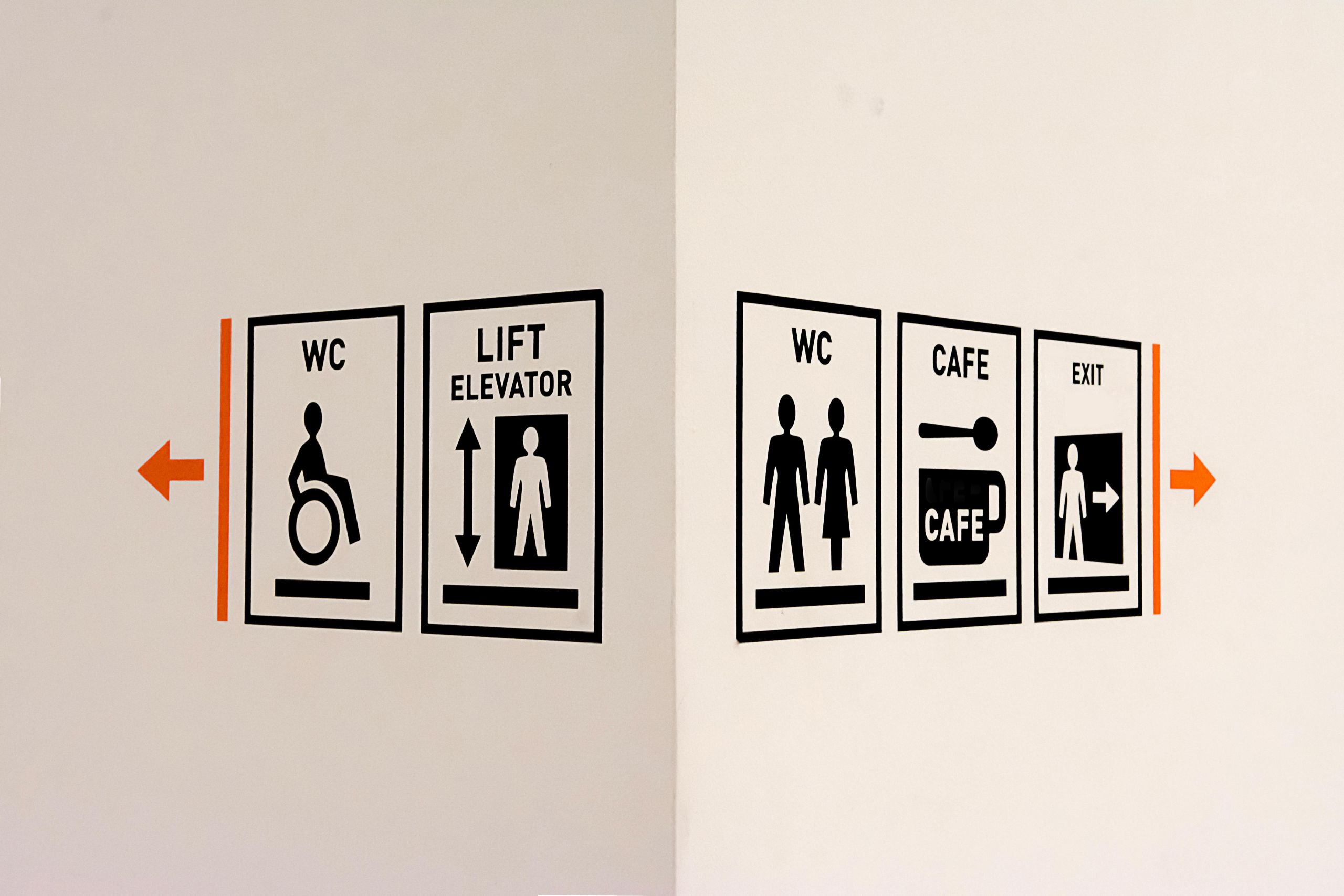 Informational panels display site maps or health-and-safety guidance, and regulatory signs ensure compliance with accessibility and fire regulations.